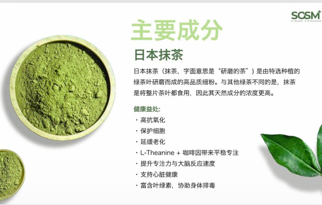 Japanese matcha (16.6%), Whey protein, Multigrains (Brown rice, Red rice, Black rice, Glutinous rice, Oat bran, Roll oats, Cereal, Wheat bran, Wheat germ, Barley, Corn, Quinoa, White sesame, Millet, Red bean, Green bean, Black soybean, Lotus seed, Walnut, Almond, Medlar, Poria, Lily bulb, Lilyturf, Euryale seed, Sago starch) (15,0%), Oat milk powder, Medium chain triglyceride (MCT) oil powder, Rice puff, MaxFenol® polyphenols-rich extract (Pine Bark, Grape Seed, Green Tea, Blueberry.