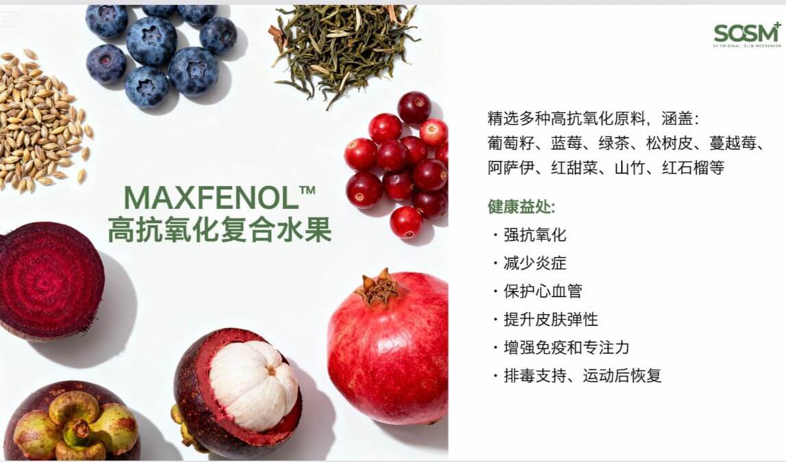 中链甘油三酯(MCT)油粉、膨化米、MaxFenol® 富含多酚复合萃取物〔松树皮、葡萄籽、绿茶、蓝莓、洋蓟、西兰花、巴西莓、蔓越莓、山竹果、枸杞、红甜菜、番茄、桃子、柠檬、奇异果、菠萝、黑加仑、草莓、芒果、橙子、苹果、石榴〕、