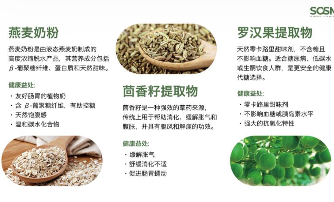 ✅ SOSM 代餐不添加精制糖,而是选用零热量罗汉果提取物作为天然代糖来源。